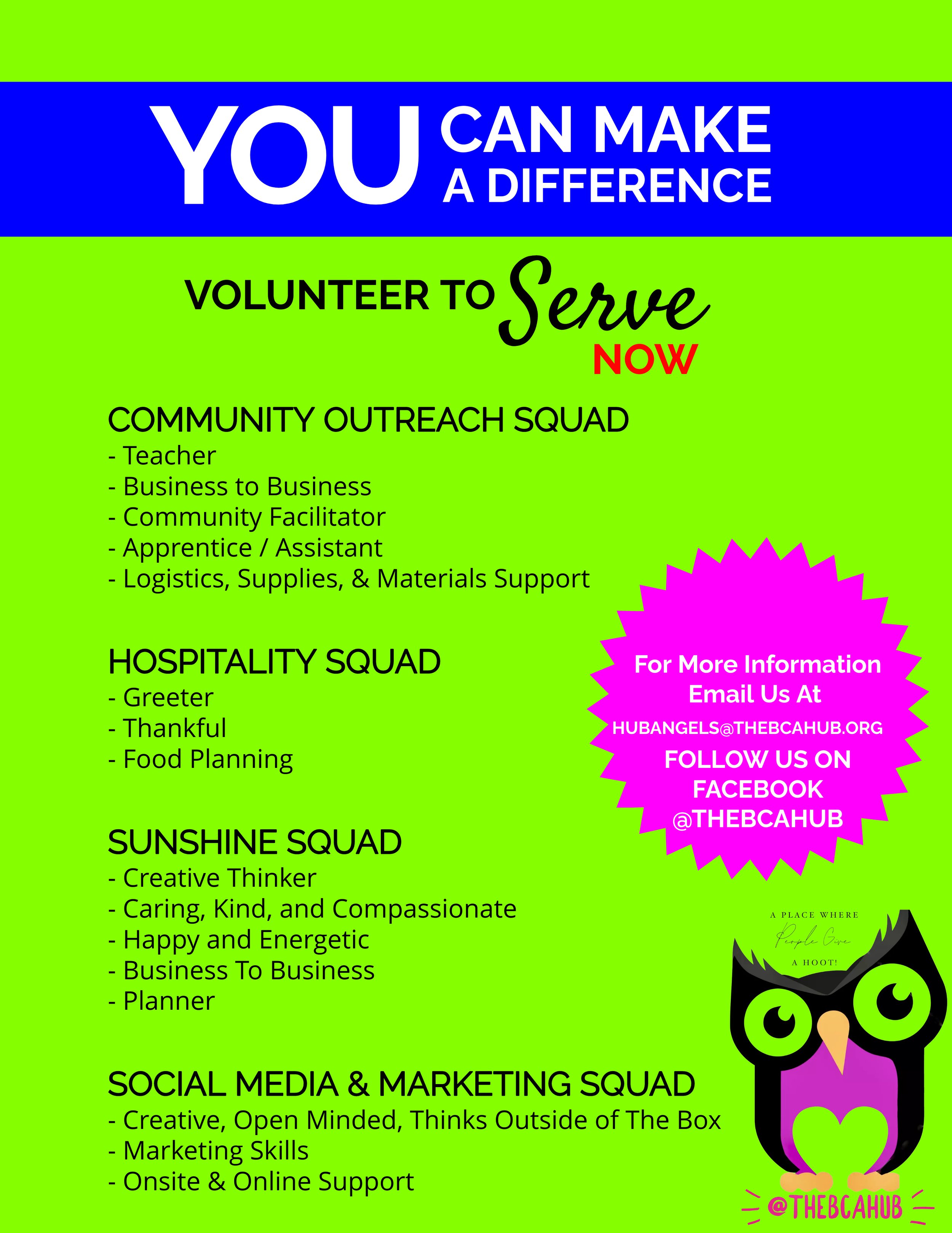 Please email our Hub Angels at HUBANGELS@THEBCAHUB.ORG and provide your: Name, Phone Number, and STATE Your Emergency.